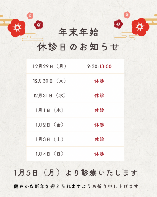 年末年始の診療につきまして、下記の通りご案内いたします。